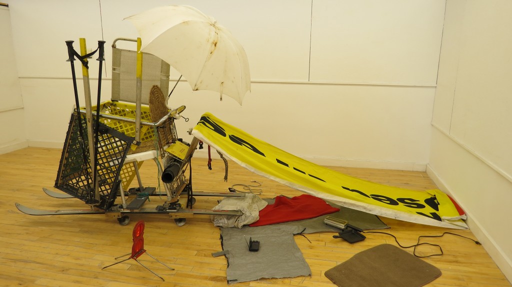 Ski Cart Title: Ski Cart Place/Time: New Bedford, Massachusetts during March 25th – April 25th, 2015 Artist-In-Residence at the College of Visual and Performing Arts, The University of Massachusetts at Dartmouth Size: 5’6″ long x 25″ wide x 52″ tall Materials: skis and poles, mill factory wheels, salvaged wood, portable radio, defrost heater unit, dickey, walking cane, shower seat assist stool, wicker seat cover, found hardware, snowpile/trashpile-found: shopping cart, banner, blanket, snow shovel handle, bread tray, car floor matt carpet, and streetside-found: pillowcase, plastic cigarette sale sign, black plastic sheeting, snowbank-snowplow height indicator stakes, umbrella, bungee, rubber stoppers, tarp piece (all materials selected for their specific and inherent story of place relevant to the concepts within this work) Details (condensed): I engineered Ski Cart to assist me in physically moving, propelling, through my landscape. I use Ski Cart as a tool, as a human-powered vehicle with wheels or skis that assist my locomotion depending on terrain. Ski Cart is an object yet also a metaphor for the path, the journey, the lifestyle that I am at the same time engineering. Details (expanded): Details from April 2020 writing about Ski Cart in its sleeping position (revisited in part due to the Covid-19 pandemic): Uncertain territory ahead, and wanting to be assured enough of my resilience and adaptability in order to thrive in a new unknown place; this is the theme that has run through my recent works of performative sculpture. Ski Cart is an adaptive mobile unit able to navigate the terrain with removable wheels to roll, or if needed, with skis to push through snow. It is made with materials gleaned from a massive city snowdump/snowpile, as well as from alleyways and streetsides specific to the city in which it was made to navigate. This cart also transforms into a shelter in place sleeping, resting area. Ski Cart explores the upheaval, turmoil and the fluidity in the definition of home. I engineered Ski Cart to assist me in physically moving, propelling, through my landscape. I use Ski Cart as a tool, as a human-powered vehicle with wheels or skis that assist my locomotion depending on terrain. Ski Cart is an object yet also a metaphor for the path, the journey, the lifestyle that I am at the same time engineering. My journey is one that embraces physical prowess and training, hard-work, and endurance. I also acknowledge the possibility of moments needing external support. Physical effort and mechanisms of assist is hinted at within this work. Ski Cart is made with materials from areas in which it is meant to maneuver, the edges of places where nature and humans collide leaving a seemingly messy residue. Ski Cart might stand out as an odd contraption but the materials it is made of blend in and thus meld with its urban surroundings. My goal is to live in a way that is resourceful, sensitive to place, and fits my uniqueness yet blends in enough to be safe. Post navigation HouseboatSki Cart