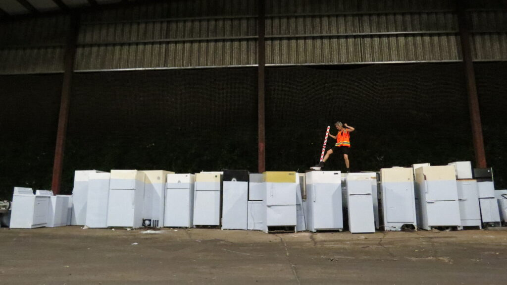 Waterline Title: Waterline Place/Time: Astoria, Oregon Transfer Station Tipping Floor / 2016 Coastal Oregon Artist Residency in Astoria, Oregon (Recology Western Oregon Artist-In-Resident) Size: varies Materials: trash refrigerators, white and blue tippingfloor-found housepaint, safety vest hazard stake: furniture wood, truckbed cover straps, bike trailer grommets, safety vest (all materials found at the dump/transfer station) Details: A line of defunct refrigerators provide a tenuous bridge in which I attempt to travel across. A waterline unifies the refrigerators into a vast waterscape and potentially rising waterline. Post navigation Survival SuitFloatboard