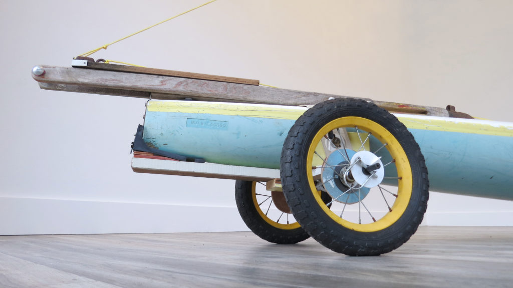 Kayak Catapult Title: Kayak CatapultTime: 2019 Size: varies, kayak 13′ x 24″ x 18″ (kayak has adjustable height and length via the catapult components)Materials: beach-found: washed ashore sit-upon kayak, tent string, tent stake, plastic, marsh-found: door/hatch latch, rope, free-pile found: flexible flag rods and hardware, canvas fabric and straps, roadside-found: plastic floor moulding, trash-found: lifejacket, paddle, conduit, hardware, roofing tine, houseboards, plastic extinguisher mount, bicycle wheels, event tent metal tube, yard-sale found: survey tripods Details (condensed): Kayak Catapult is a machine meant to attempt to launch communication over borders across divides. It is a working contraption, capable of rolling or floating, engineered with a catapult component used to fling messages over walls, across rivers that divide, through barriers of communication. Kayak Catapult, is a large, odd, low-tech contraption potentially ill-fitting to its task. At the same time there is a willingness to persist, to keep trying, pushing through what seems unimaginable and impossible, awkward or ridiculous. It is my hope that through perseverance there is momentum through difficulty. Details (expanded):Within Kayak Catapult exists my wish to launch communication over boundaries and across divides. Kayak Catapult is a working contraption, built to adapt, capable of rolling or floating, and engineered with a catapult component used to fling messages over walls, across rivers that divide, through barriers of communication. I use this sculpture to explore my feelings and modes of operation regarding circumstances that seem impossible, insurmountable. I carry with me a tinge of defeat, existing as awareness of dysfunction, unpredictability and uncertainness. I embrace the potential of misaligned trajectories, launches that fail, and the necessity of multiple attempts. Test-Rolls, Test-Floats, and Test-Flings become in part preparedness drills, training, tests of endurance and fortitude. Operating Kayak Catapult is cumbersome and a bit precarious; it pushes the limits of my physical strength, safety and comfort levels. I acknowledge the ridiculous essence within Kayak Catapult, a large, odd, low-tech contraption potentially ill-fitting to its task. At the same time there is a willingness to persist, to keep trying, pushing through what seems unimaginable and impossible, awkward or ridiculous. It is my hope that through perseverance there is momentum through difficulty. While in the gallery Kayak Catapult is in dry dock; an altered survey tripod holds the boat stationary and elevated in a 3-point supported position. The angled legs of the tripod mimic the structure and function of the jack stands, poppets and boat blocks that hold watercraft in suspension while on land in the boat yard. In general a boat in dry dock seems to be held in an awkward, motionless and stalled position, suspended as an object and also halted in purpose. In a boat yard each boat, with exposed out-of-the-water hulls, is balanced and precariously blocked and shimmed into an odd static limbo on land while in for repairs or to wait out the off-season. I embrace the awkward, held in standstill, essence of dry dock as a concept, I am also interested conceptually in the information inherent within the nature of this tripod. The markings on the tripod point to its history as a survey tool establishing official land, airspace and water boundaries. Together these elements enhance Kayak Catapult’s use as an awkward tool in which to attempt to launch communication across boundaries. These attempts use momentum and perseverance to hold onto purpose, trying to push through what seems hopeless, insurmountable. Post navigation Kayak Catapult: Test-FloatKayak Catapult: Dry-Dock