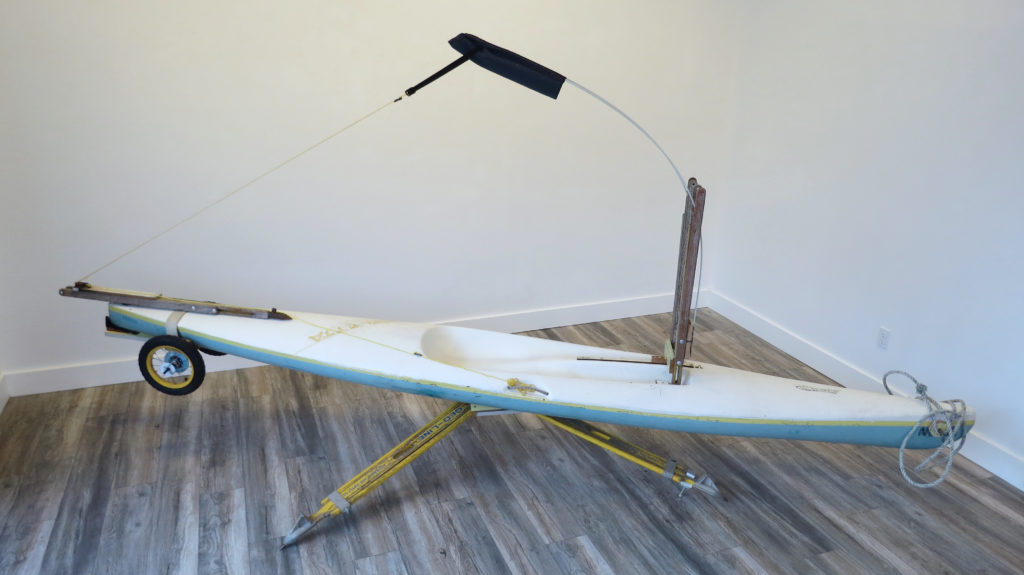 Kayak Catapult: Dry-Dock Title: Kayak Catapult: Dry-DockTime: 2019 Size: varies, kayak 13′ x 24″ x 18″ (kayak has adjustable height and length via the catapult components)Materials: beach-found: washed ashore sit-upon kayak, tent string, tent stake, plastic, marsh-found: door/hatch latch, rope, free-pile found: flexible flag rods and hardware, canvas fabric and straps, roadside-found: plastic floor moulding, trash-found: lifejacket, paddle, conduit, hardware, roofing tine, houseboards, plastic extinguisher mount, bicycle wheels, event tent metal tube, yard-sale found: survey tripods Details (condensed): Kayak Catapult is a machine meant to attempt to launch communication over borders across divides. It is a working contraption, capable of rolling or floating, engineered with a catapult component used to fling messages over walls, across rivers that divide, through barriers of communication. Kayak Catapult, is a large, odd, low-tech contraption potentially ill-fitting to its task. At the same time there is a willingness to persist, to keep trying, pushing through what seems unimaginable and impossible, awkward or ridiculous. It is my hope that through perseverance there is momentum through difficulty. Details (expanded):Within Kayak Catapult exists my wish to launch communication over boundaries and across divides. Kayak Catapult is a working contraption, built to adapt, capable of rolling or floating, and engineered with a catapult component used to fling messages over walls, across rivers that divide, through barriers of communication. I use this sculpture to explore my feelings and modes of operation regarding circumstances that seem impossible, insurmountable. I carry with me a tinge of defeat, existing as awareness of dysfunction, unpredictability and uncertainness. I embrace the potential of misaligned trajectories, launches that fail, and the necessity of multiple attempts. Test-Rolls, Test-Floats, and Test-Flings become in part preparedness drills, training, tests of endurance and fortitude. Operating Kayak Catapult is cumbersome and a bit precarious; it pushes the limits of my physical strength, safety and comfort levels. I acknowledge the ridiculous essence within Kayak Catapult, a large, odd, low-tech contraption potentially ill-fitting to its task. At the same time there is a willingness to persist, to keep trying, pushing through what seems unimaginable and impossible, awkward or ridiculous. It is my hope that through perseverance there is momentum through difficulty. While in the gallery Kayak Catapult is in dry dock; an altered survey tripod holds the boat stationary and elevated in a 3-point supported position. The angled legs of the tripod mimic the structure and function of the jack stands, poppets and boat blocks that hold watercraft in suspension while on land in the boat yard. In general a boat in dry dock seems to be held in an awkward, motionless and stalled position, suspended as an object and also halted in purpose. In a boat yard each boat, with exposed out-of-the-water hulls, is balanced and precariously blocked and shimmed into an odd static limbo on land while in for repairs or to wait out the off-season. I embrace the awkward, held in standstill, essence of dry dock as a concept, I am also interested conceptually in the information inherent within the nature of this tripod. The markings on the tripod point to its history as a survey tool establishing official land, airspace and water boundaries. Together these elements enhance Kayak Catapult’s use as an awkward tool in which to attempt to launch communication across boundaries. These attempts use momentum and perseverance to hold onto purpose, trying to push through what seems hopeless, insurmountable. Post navigation Kayak CatapultFugitive