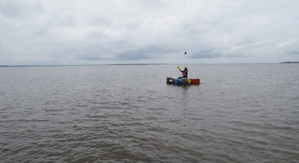 Liferaft Title: Liferaft Time/Place: 2020 near the mouth of the Columbia River, Washington USA Size: 8′ x 7′ 6″ x 6′ 2″ Materials: 14 plastic coolers found in the dump, paddle found in the dump, ratchet-straps found on the side of the road and in the dump, flag on pole found on the road, boat bumper floats and line found along the harbor, handles, patches, rope and row locks from a discarded inflatable boat, and lifejacket made with canvas from discarded beach lounge chairs, trashed foam sheets and road straps and buckle Details: Implementing a mechanism of survival is not a safe feeling; it is one of risk and uncertainty and maybe just barely making it. The solo nature of this work and many of my pieces reflect my extreme independence as a trauma response. It contains a longing for trust in the universe, in humanity and political systems to help and protect when needed. As an artist spending time in this place I acknowledge and pay respect toward the Chinook and Lower Chinook and honor them as stewards of this unceded land throughout generations. Post navigation LiferaftLiferaft