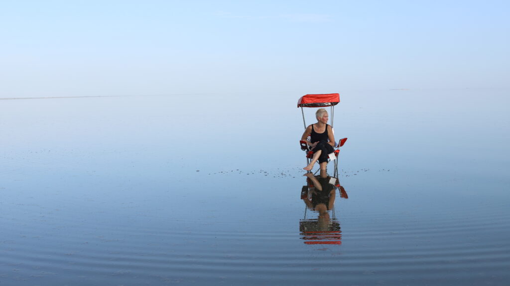 Climate Watch Chair Title: Climate Watch Chair Time/Place: July 26, 2022 / Salton Sea, California while at Joshua Tree Highlands Artist Residency, Joshua Tree, California USA Size: chair on platform 67″tall x 37″wide x 50″deeptemperature: 101 degrees F / 37.78 degrees C heat index: 107 degrees F / 40 degrees C 34% humidity Materials: beach discarded lounge chair, desert dry wash found metal table leg and wood, yard sale wheels, ascotherm raft/lifeboat thermal survival suit, wood, threaded rod, discarded: luggage handle, straps, tie-down clamps, plastic moulding, discarded HVAC (Heating, Ventilation And Air Conditioning) foil-faced reflective radiant barrier thermal resistance duct insulation Details:This sculpture is a lounge chair, complete with cupholder and awning, in which to sit and watch the climate change. Climate Watch Chair is conveniently collapsible and may be carried and placed anywhere. A wheeled platform, floating pad and heat reflective material assists in mobility and adaptability as the climate crisis events cycle through floods, drought and fire. The performative element is at the Salton Sea, an environmental hotspot and jumble of human interventions in the Colorado Desert of southern California. In this work I am using my awareness of the Salton Sea’s layered history in combination with today’s political and environmental status and the circular cycles seemingly evident in all mentioned. I know that at this time I do not in general have hope and at this moment I am trying to intellectually and scientifically understand and recognize where we are planetarily and humanly. Post navigation Climate Watch ChairClimate Watch Chair