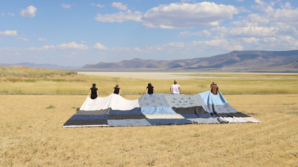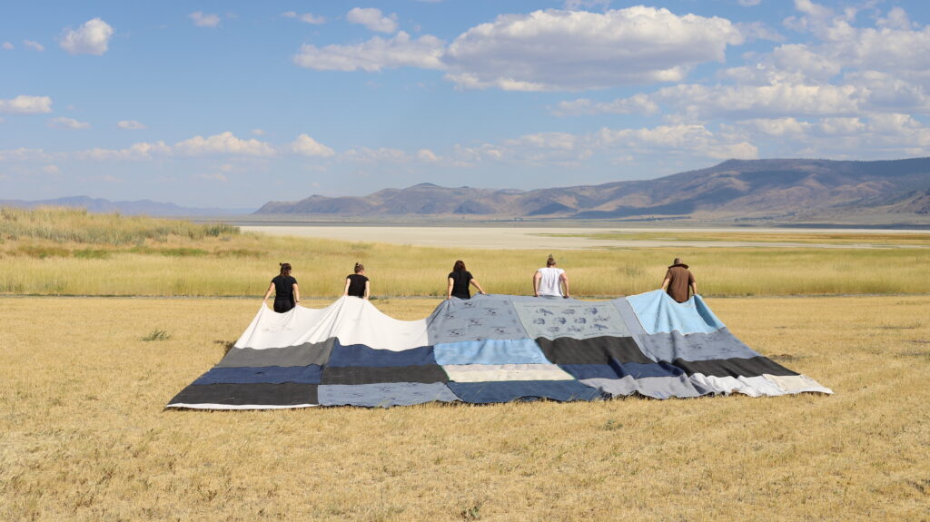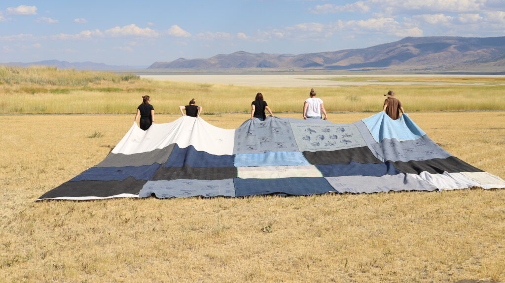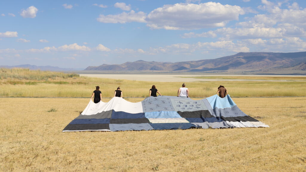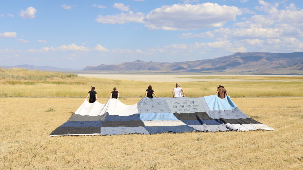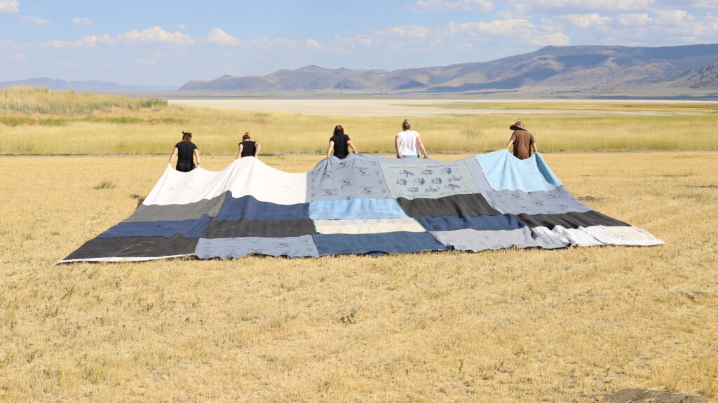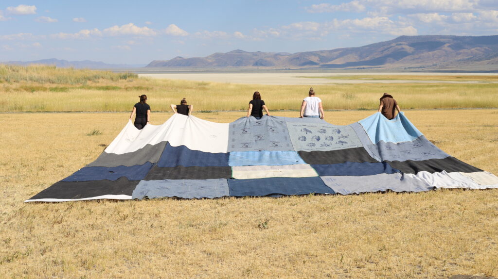 Communal Moving Blanket Title: Communal Moving Blanket Time: July-August 2023 while Artist-In-Residence at Playa near Summer Lake, Oregon USA Size: 30′ x 30′ Materials: used moving blankets and fabrics used for moving, collected from acquaintances, strangers and businesses from various parts of the USA Thank you to the following participants who made an important collective moment in this work possible: Clare Benson Ivy Guild Jennifer Gunlock Carrie Hardison Mike Thompson Details: Moving blankets are thick and durable and meant to protect and cushion. Communal Moving Blanket is a collection of used moving blankets sewn together as one large quilt-like blanket. The fabrics are visibly used, worn-out, faded with stains, rips and frayed edges, likely from decades of use involving hundreds of people and diverse scenarios of moving. I embrace the inherent stories in these pieces of fabric each used during points of transition and moments in motion, moving. As our world heads into the future of climate change we also head into an upheaval of climate displacement, one of managed retreat, complex with stories of those with the resources in which to choose to move, forced removal, communities moved and/or cultures dissolved. In gathering these used moving blankets, from acquaintances, strangers and businesses from various part of the USA, and sewing the fabrics together I am also stitching together all of those stories. I join these moving blankets together in my desire for us to unite and help each other move forward. It is my hope for the communal assistance and unification that will help us all to not only survive, but thrive with equity during our climate migration. Post navigation Communal Moving BlanketWaterbike