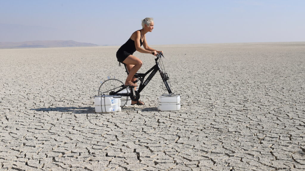 Waterbike Title: Waterbike Time/Place: This work was made during my July-August, 2023 Artist-In-Residence at Playa near Summer Lake, Oregon USA Size: 40″ x 52″ x 61″ Materials: bicycle, plastic water jugs, irrigation tubing, car roof rack, metal campfire cooking rack, highway guardrail reflector, plastic liner from a 5-gallon round water cooler, stakes from a pop-up shade tent, license plate, load straps, clamps (most materials found in the playa/desert or roadside or local yard/estate sale free piles) Details (condensed): “A dry lake bed, also known as a playa, is a basin or depression that formerly contained a standing surface water body, which disappears when evaporation processes exceed recharge.” Wikipedia Pairing this water bike with the landscape of the desert allows me to reflect on the cycle of weather/climate extremes and how we might survive, how I might I survive in a devoid landscape. Details (expanded): “A dry lake bed, also known as a playa, is a basin or depression that formerly contained a standing surface water body, which disappears when evaporation processes exceed recharge.” Wikipedia Pairing this water bike with the landscape of the desert allows me to reflect on the cycle of weather/climate extremes and how we might survive, how I might I survive in a devoid landscape. The low-tech nature of this contraption points toward resourcefulness and patience, challenging notions of navigating a landscape. Waterbike is a bit ridiculous, potentially humorous, yet also stems from the chasm that I feel, loneliness and deep emotional distress about how the climate crisis affects humans unequally due to systematic dysfunction and foundational inequalities. Post navigation WaterbikeHot Seat