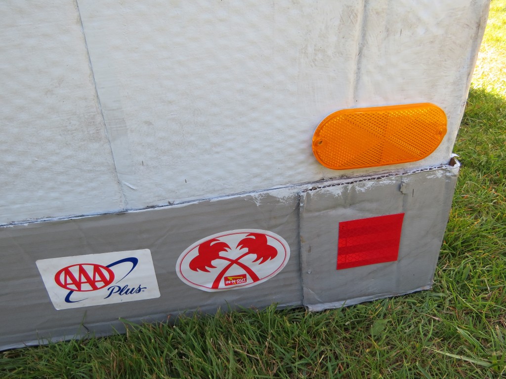 Cardboardhouse (photos in the RV Park at The Sou’wester Lodge) Title: Cardboardhouse Place/Time: Artist-In-Residence at The Sou’wester in Seaview, Washington for the month of July 2014 Size: house is 5’5″ tall x 6’10” wide x 7′ long (5″ slope shed roof) Materials: house: cardboard, woodglue, housepaint from nearby garage sale free piles chassis/wheels: bike trailer and walker (mobility aid) altered and combined into one unit pulled by a bicycle (The walker is a metal tube frame with small wheels typically used as a mobility aid for the elderly or injured. The bicycle was on loan to me for the month via a local community member.) Details (condensed): Cardboardhouse was built as a large house, as big as possible yet light enough to be pulled behind a bicycle. Cardboardhouse can be wheeled around on its structure, a combined bike trailer and walker (a metal tubing frame with small wheels used as a mobility aid), and then removed from the wheels and placed in a spot as a shelter. This structure gives me the chance to explore my thoughts about living and what might or might not be deemed as an age-appropriate lifestyle. Details (expanded): Wondering if I can build my own house, both literally and metaphorically, has been a thought on my mind for a long time. In my work the last few years I have been using the house as an object and a metaphor, an opportunity to tangibly explore my thoughts about community, lifestyle, what I need to survive and importantly at the moment, which of these things I can accomplish via my resourcefulness versus leaning on my community for support. My time at The Sou’wester as Artist-In-Residence has given me the chance to answer a question I have been asking myself since 2011, “Can I build a house in which I can pull behind my bicycle?” At The Sou’wester I felt relatively at ease to explore this silly question, one that makes me laugh at its ridiculousness and a bit apprehensive about making due to the fact that after completion I knew this piece needed to be wheeled out into the public realm in some fashion, by sorta-shy me, the driver of this strange, too-big-to-ignore, bicycle-pulled Cardboardhouse. This apprehension points in part to the concept behind this work, my wish to live a lifestyle that suits the oddity of me, yet still blend in enough to be comfortable and safe without feeling the need to explain and defend my choices. The technical problems of constructing this work felt in tandem with issues I grapple with regarding how to live. Is this house possible to engineer? How big can I make this house and still be able to move it around all by myself? Can I source all the materials for this house myself in a way that honors this new place I am living? This Cardboardhouse will stand out as an oddity but, can I make it blend in enough with the other buildings around me to be safe and fit in? Upon landing within the Sou’wester community I immediately sensed that The Sou’wester would be a graceful space in which I could comfortably explore this work and indeed it was. The Sou’wester is full of diverse travelers and lots of homes on wheels. I found a forum for my ideas about lifestyle and my Cardboardhouse seemed to fit right in with the other houses on wheels, the vintage travel trailers and vehicles in the RV park. Thank you to The Sou’wester for supporting me! Post navigation CardboardhouseCardboardhouse